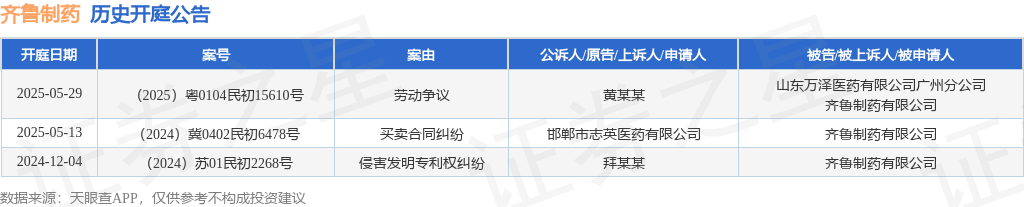 本站消息,根据天眼查APP显示,近日公布了一则齐鲁制药有限公司作为被告/被上诉人的开庭公告,详细内容如下: